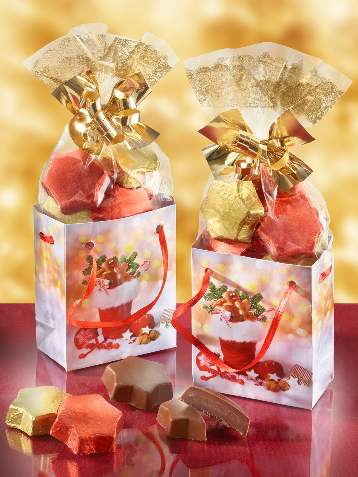Ein ideales Mitbringsel zur Weihnachtszeit! Vier Weihnachtsmann-Tütchen gefüllt mit je 50 g Vollmilch-Schokoladen-Spaß. Tütenhöhe: ca. 10 cm.