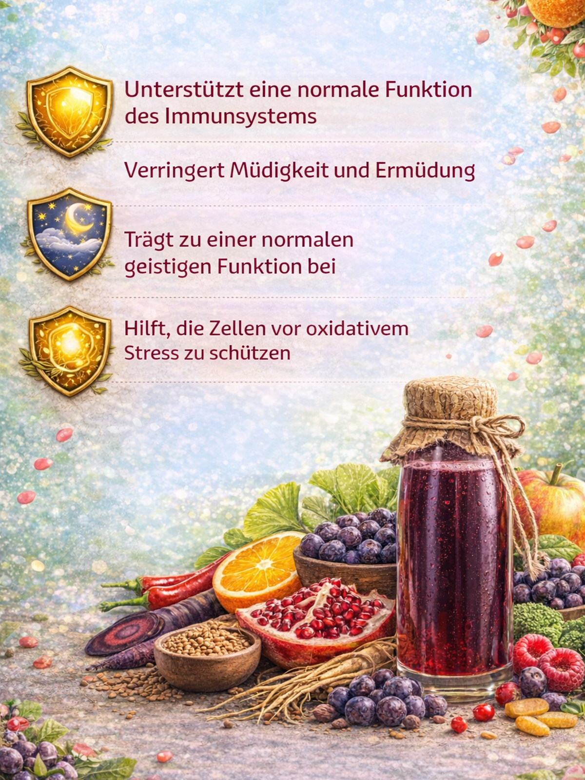 Fruchtsaftkonzentrat (75%) aus Granatäpfeln, Äpfeln, Orangen, roten Trauben, Holunder, Ananas, Passionsfrüchten, Brom¬beeren, Johannisbeeren, Zitronen, Gemüsesaftkonzentrat und Ölen (20%) aus schwarzen Karotten, roten Beeten, Leinsamenöl, Obst-/ Gemüse- und Kräuterextrakten (5%) von Kurkuma, Himbeeren, Bockshornkleesamen, Acai, Acerola, Boabab, Brokkoli, Sauerkirschen, Brombeeren, Camu-Camu, Chlorella, Erbsenprotein, Grünkohl, Rosmarin, Basilikum, Salbei, Grapefruit, Karotten, Maca, Mango, Papaya, Spinat, Thymian, Hagebutte, Ingwer, Flohsamen, Aroniabeeren.