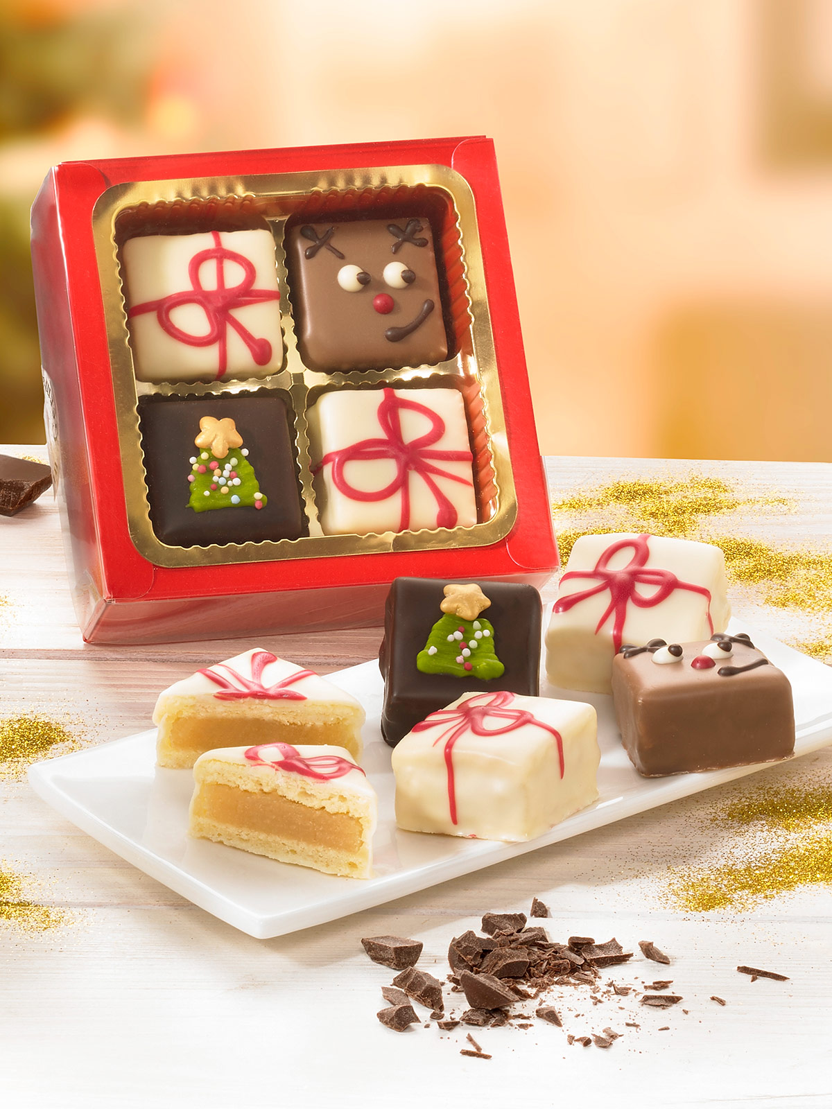 Französischen Flair genießen Sie mit den weihnachtlichen Petit-Fours aus dem Hause Rabbel. Mit edler belgischer Kuvertüre überzogen und von Meisterhand ausgarniert bieten die kleinen Köstlichkeiten aus zarten Böden, Marzipan und feinstem Canache in den Geschmacksrichtungen Schokolade, Mocca, Kirsch und Rum höchsten Genuss für alle Feinschmecker. Unsere jahrelange Erfahrung, beste Zutaten und die Liebe zum Detail machen den Unterschied, überzeugen Sie sich selbst. Leicht mit Alkohol verfeinert. 70 g.